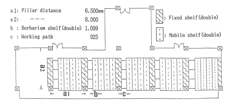 国立科学博物館の顕花植物おしば標本室では、1988年はじめに従来の固定式標本棚を移動式に切り換えた。従来当館の維管束植物部門では、移動棚は標本整理のための作業スペースを十分確保できる見込みが少ないため消極的だったが、標本数増加にともなって収容面積が不足してきたため、やむなく導入したものである。予算執行時期の関係で、切り換えに先立って設備の仕様や工事手順について十分な検討をする時間がなかったが、ともかく手動式台車の上に従来使用してきた標本棚をそのまま載せる形とした。新しい配置を図1に示す。これまではここに示す室全体に同数の標本棚が配置されていた。この工事の結果、従来は438㎡の床面積にあった標本棚が、323㎡(73.7%)に収容された。