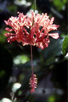 そんな隙間好きの私のアンテナを、このところビリビリ刺戟しているのがハイビスカスの「エル カピトリオ」(El Capitolio)という呼称を冠して売られている園芸品種群です。「フラミンゴタイプ」ともよばれていますが、フウリンブッソウゲのように下向きに垂れるように咲きます。